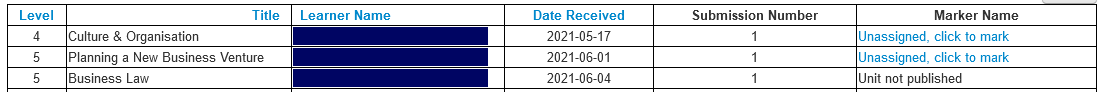 To begin marking an assignment, click on the "Unassigned, click to mark" in the far right column. This will then record that you are marking this assignment, and other markers will not be able to mark it.