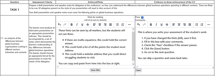 Each task has: Text (to hold the text the student will see), Assessment Criteria (for the student's and markers to see), and Assessment Hints (only the marker's see this field. It could hold hints, or correct answers).