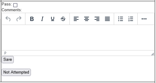 - This area has a checkbox for whether the answer provided passes. Then there is a simple editor where you can write your assessment of this answer.