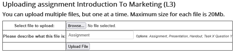 - Enter a description of the file. Your main file should be described as "Assignment", and this is the default for this box. Other options could include Presentation, Handout, Task X Question Y, or anything similar that describes what the file is about. Do not enter your name, or the file name. This is just to describe the document.